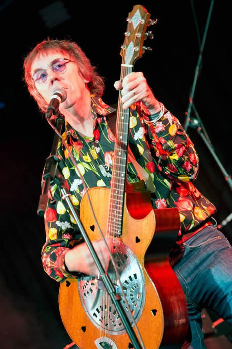 Above : The rear cover of "Strat in the attic2"showing Keith's guitar aqcuired from Mike Oldfield. Above : Keith playing the Ex Marc Bolan/Mike Oldfield guitar in the studio with SJWA. 13th September 2014 : Keith Smart played a short set of Ronnie Lane songs using Ronnie Lane's Zemaitis resonator, at The Small Faces convention in London. For the last song Glen Matlock of The Sex Pistols and The Faces came up on stage to sing Debris. Stan Lane introduced proceedings, then came on at the end to say a few words. Photo by David Coombs.