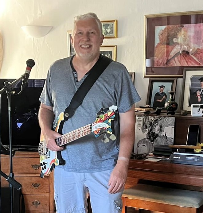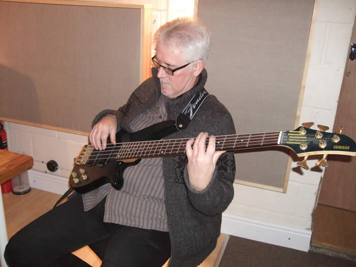 Above : Almost ready to rock, Adrian limbering up on bass.