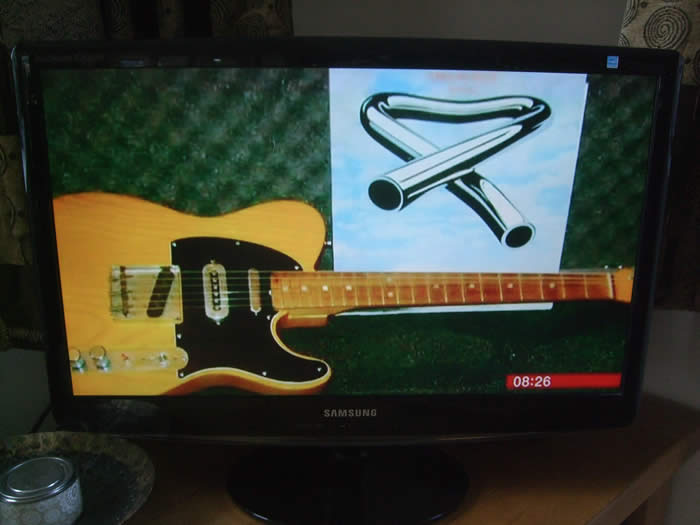 April 2016 : Keith's ex Mike Oldfield / Marc Bolan Telecaster was featured on BBC Breakfast. They gave a brief history of it, as part of Vinyl record day. Above : Keith's ex Mike Oldfield / Marc Bolan Telecaster on BBC Breakfast 14th April 2016.