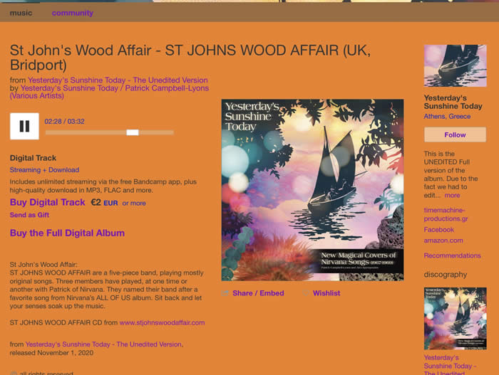 Above : ST JOHNS WOOD AFFAIR playing live in 2019. 25th February 2020 : St Johns Wood Affair are knocked out to have a song on this album. It celebrates the music of the psychedelic band Nirvana. Fabulous songs written by Patrick Campbell Lyons and Alex Spyropoulos. Bands from all over the world have covered their favourite songs. I still have the “All of us” vinyl album, by them. I bought this while still at school! Who knew that I would record and play live with them years later. We recorded a version of the song “St Johns Wood Affair." The album is due out August 2020