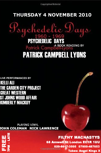 4th November 2010. We had a great time at Filthy McNasty's in Islington. We backed singer Kelli Ali when she sang TINY GODDESS. Pat and Carlton were not there, so we did not have bass or drums. We played our versions of ORANGE AND BLUE and also FLOWERS FOR FRIDAY. It was an acoustic evening, but I still managed to make my guitar sound strange! Patrick read from his book PSYCHEDELIC DAYS and closed the show singing I BELIEVE IN MAGIC, ALL OF US and RAINBOW CHASER. The crowd loved him. It was a really good venue and everyone enjoyed the show. Click on the link below to see a clip of St Johns Wood Affair playing FLOWERS FOR FRIDAY. Click here to see a clip of the band