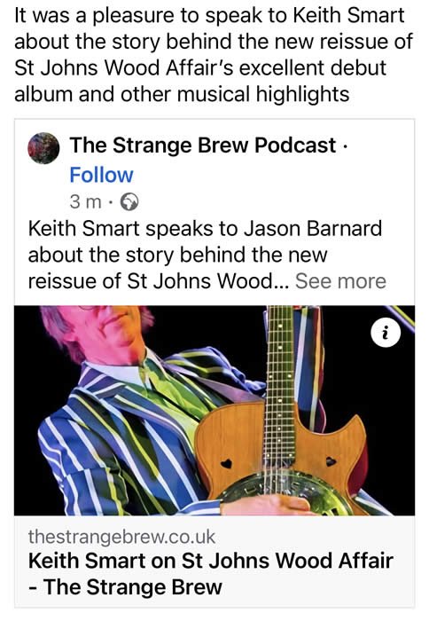 3rd October 2023. THE STRANGE BREW PODCAST published the interview they did with me yesterday. I spoke about ST JOHNS WOOD AFFAIR and the making of our album, plus other bands I have played with. You can read the interview on www.thestrangebrew.co.uk